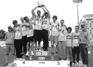 The Lopez boy’s track team celebrates their second place finish over 26 other teams at the 1B State Track and Field Championships. Left to right: Assistant coach Mike Strom