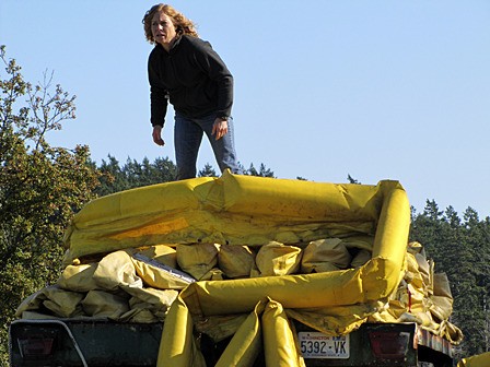 She and I go back to her black chevy blazer (she often forgets to close the doors) and drive over to another inlet of Fisherman bay where about 1,000 feet of boom is neatly stacked on a trailer. Knight clambers up on the pile of boom like a sailor, nimbly untying the rope holding it down. The other team members arrive by boat and come up from the shore as she measures out the boom, section by section, and gives it to each team to drag down the rocky beach and out onto the water.