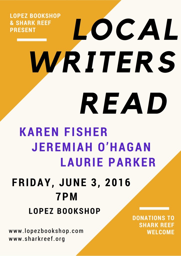 Lopez Bookshop and “SHARK REEF” literary journal are delighted to present Lopez writers Karen Fisher and Laurie Parker plus “SHARK REEF” co-editor Jeremiah O’Hagan at the Local Writers Read event at Lopez Bookshop, Friday, June 3, at 7 p.m.
