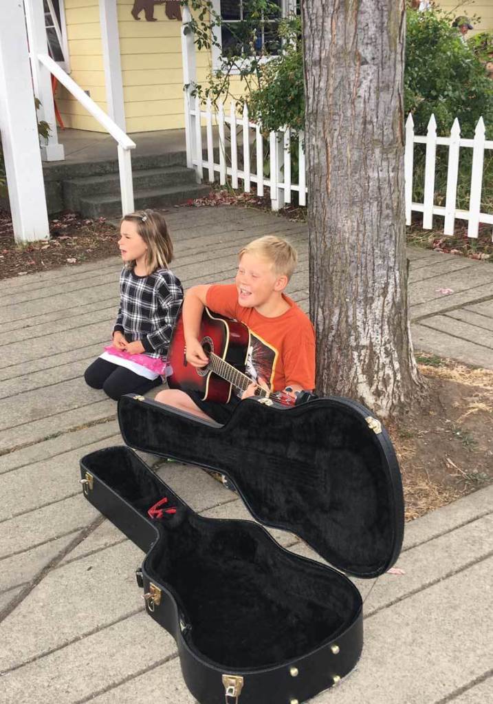 Eastsound was bustling over Labor Day weekend, and a pair of young buskers set up in front of Brown Bear Baking on Saturday, Sept. 3.