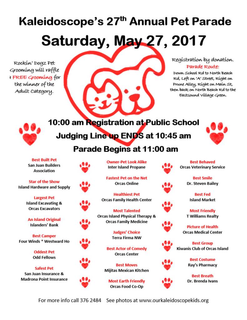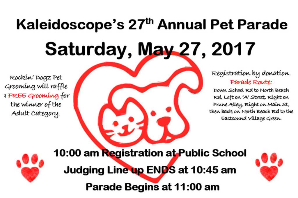 Kaleidoscope Pet Parade and award ceremony, Saturday, May 27 at 11 a.m. Registration at 10 a.m. at the public school and lineup is at 10:45 a.m.
