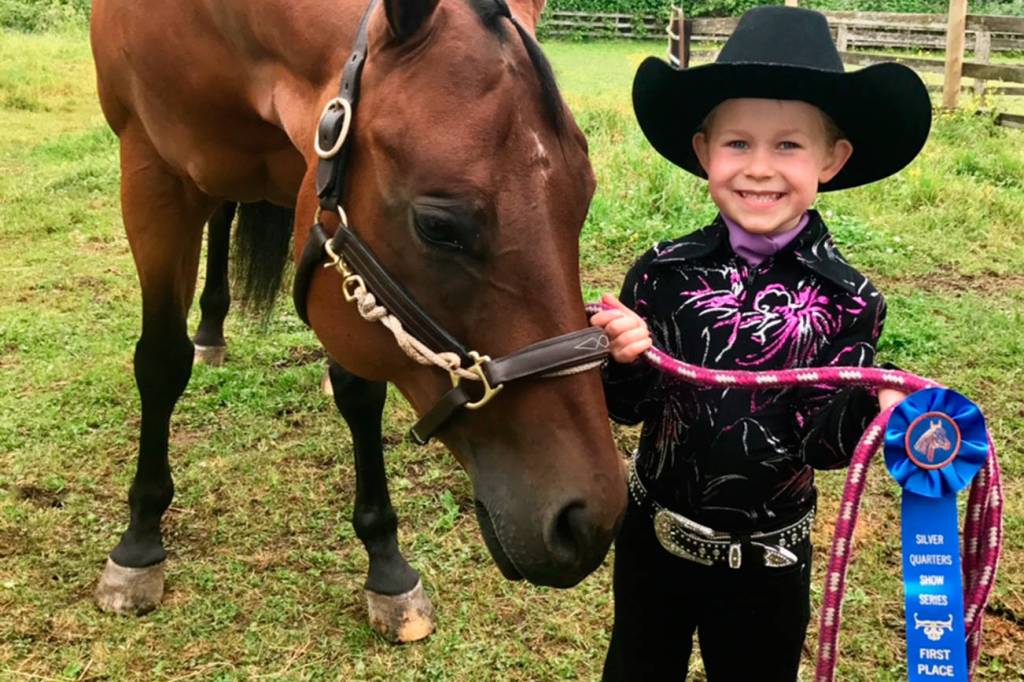 Five-year-old Grace Zwilling won first place in showmanship for ages 13 and under in a Washington State Horsemen Zone Show “Silver Quarters” on June 17–18 in Bow, Washington. She also won high point (combined points for all classes) for western 13 and under. Zwilling trains with Alicia Miller.