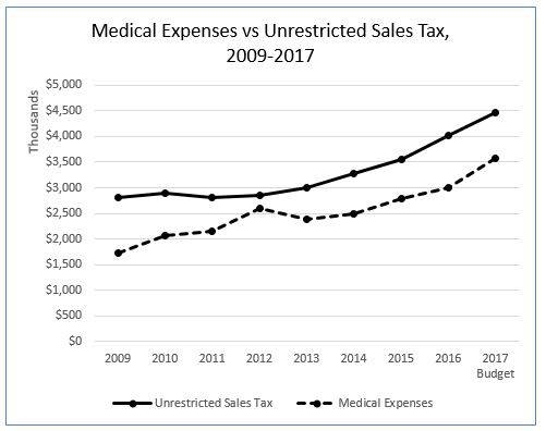 To visualize the question, I graphed the county’s unrestricted sales tax revenue against the County’s cost for medical insurance, including dental insurance and HSA (Health Savings Accounts) contributions. Both have grown substantially in the past eight years. Sales tax is higher – that is, we bring in more in unrestricted sales tax revenue than we pay out for medical insurance – but the growth trends are similar. Sales tax has grown more steadily, following a recession-related decline. Medical costs have grown more erratically, with a marked drop in 2013, when the County changed medical plans in order to save money. Despite the change, medical insurance costs have grown 107% from 2009 to 2017, compared to 59% for sales tax. As a result, the gap between the two has lessened – from about $1.1 million to about $.9 million. Medical costs used to equal 61% of local option sales tax; they are now 79%. If these trends continue, it won’t be long before the county’s local option sales tax – its only unrestricted sales tax revenue – is paying for nothing but medical insurance for its employees.