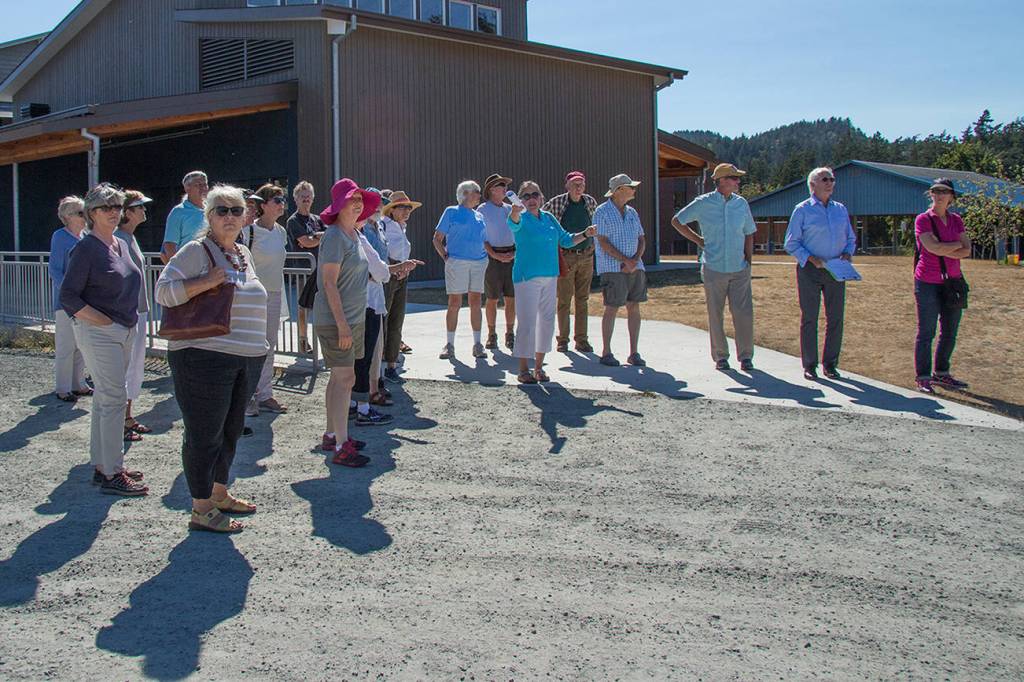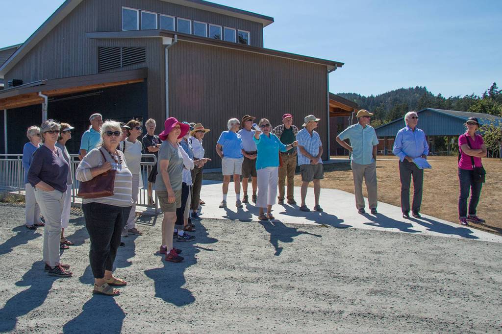 More than 25 people clustered around OICF Executive Director Hilary Canty as she stood in front of the old gym at the Orcas Island School on Monday, Aug. 28 at the beginning of a walking tour of the town.