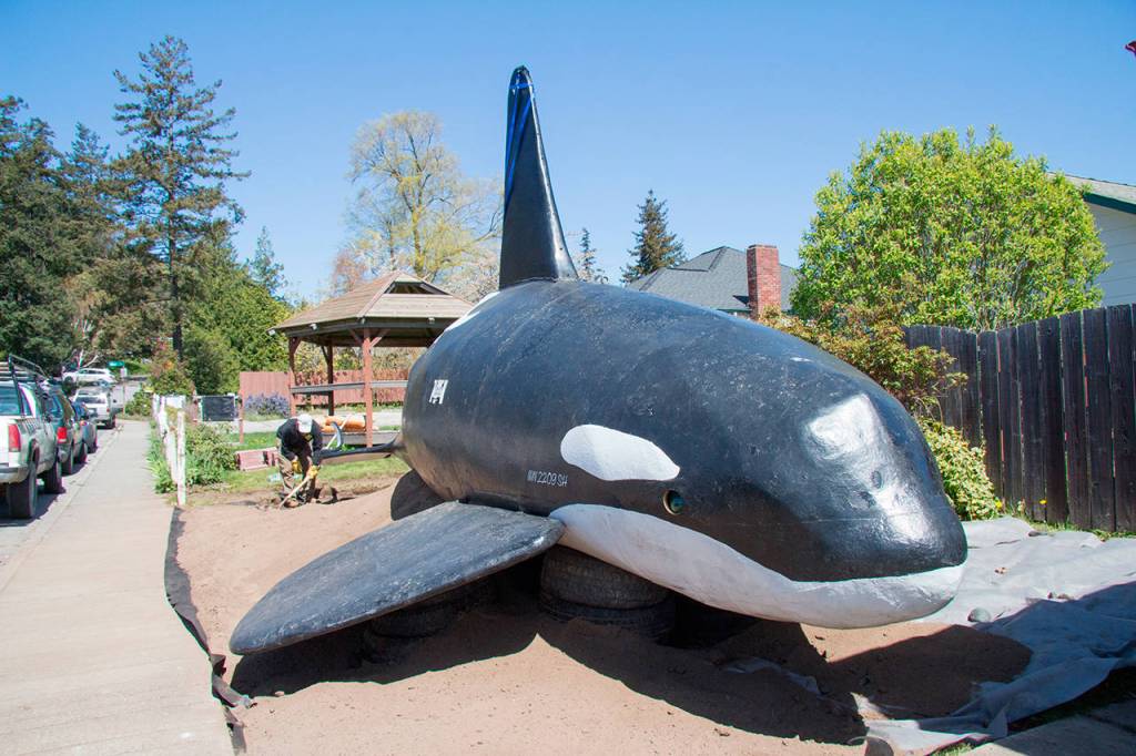 It’s hard to miss the 30-foot orca that has landed on the east side of North Beach Road.