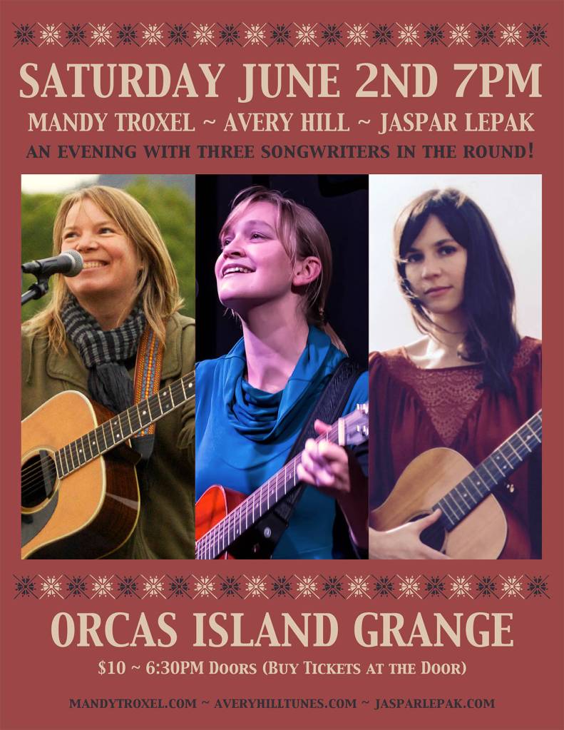 Local singer-songwriter Mandy Troxel is bringing two songwriting friends, Jaspar Lepak and Avery Hill, to the island for two unique opportunities for island music lovers at 7 p.m. on Saturday, June 2. at the Grange. This dynamic trio of musicians is pleased to offer a songwriting workshop.