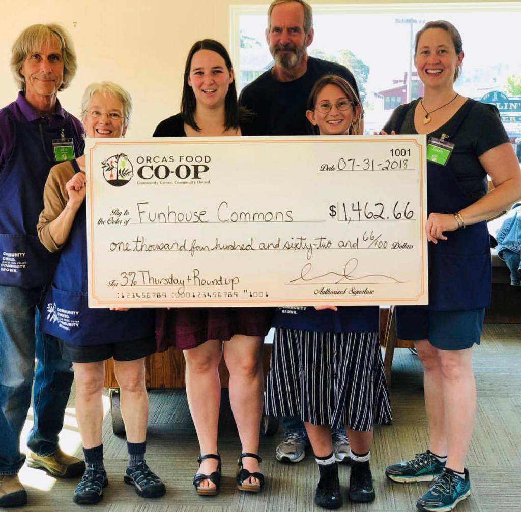 Two years ago, Orcas Food Co-op launched a community shopping day program called “3 % Thursdays.” On the third Thursday of each month, 3 percent of the gross receipts of Orcas Food Co-op are donated to preselected community organizations. Last month, 3% Thursday and Roundup at the register sales contributed a total of $1,462.66 to The Funhouse Commons. Pictured here is Funhouse Executive Director Emilie Gincig (third from left) with food co-op staff members. This month the Farm to Cafeteria Program will receive 3 percent of the gross receipts of food co-op sales on Thursday, Aug. 16.