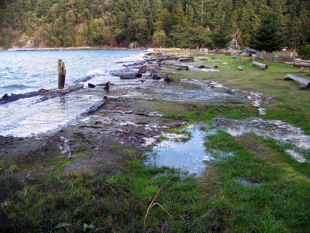As residents of a community of islands, we are no stranger to coastal storms like the one that hit northern Puget Sound just before Christmas. While winter storms themselves are not uncommon, the larger events that cause serious damage from erosion or flooding are actually quite rare here in the San Juans. Unlike the open coast and other parts of the country where erosion is measured in feet not inches, long-term annual erosion rates in the islands average an inch or less annually for most shorelines. Even the most rapidly eroding areas – the sediment supply or ‘feeder’ bluffs – erode at an average rate of under six inches per year here in the San Juans.