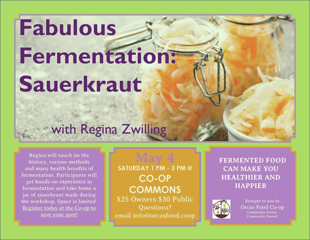 Join Regina Zwilling to learn more about the many health benefits of traditionally fermented foods on Saturday, May 4 from 1-3 p.m. The cost is $25 for member-owners and $30 for the public. Participants will get hands-on experience in making sauerkraut and will take a home a jar of organic kraut made during the class in the Co-op Commons. Kids are welcome.