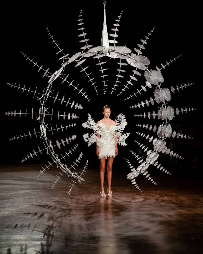 “We are deeply thankful to have collaborated with Anthony Howe for the past five months on both the ‘Omniverse’’ sculpture and the ‘Infinity’ finale dress. The dress comes alive on the breath of a finely balanced mechanism,” van Herpen wrote on her Instagram.