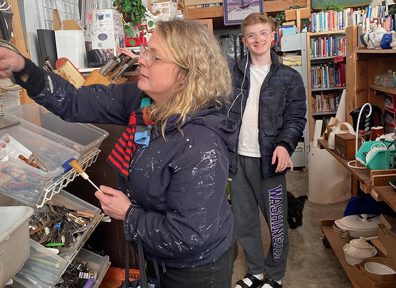Pictured are Brook and her son, Henry Meinhardt-Moe, picking out random items from The Exchange, the reuse store on Orcas and co-sponsor of the program, to include in the art kits.