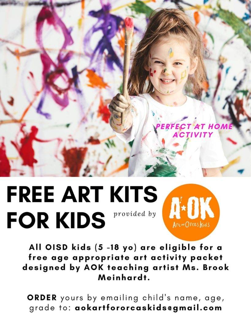 The program is being financially sponsored by generous donors to the AOK arts program for kids. Orcas families can order the free kits for their children by emailing aokartfororcaskids@gmail.com. Include the child’s name, age and grade. Tax-deductible donations are also happily encouraged!