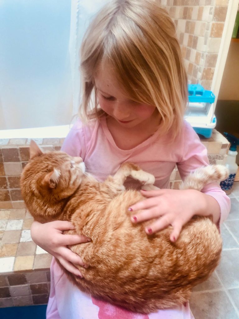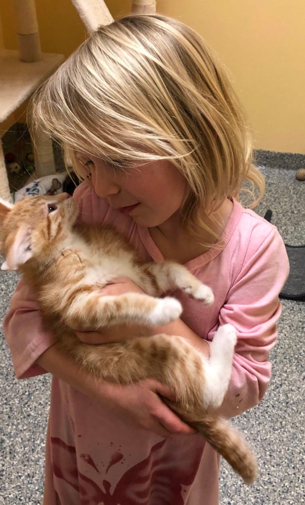 And a few days later, with gloves and masks on, Grace and her mom walked into the shelter to be reunited with her now full-grown orange kitten. Kristina wanted to make sure it was still a good match before proceeding. And it was as though no time had passed. He immediately went to Grace and didn’t leave her side.