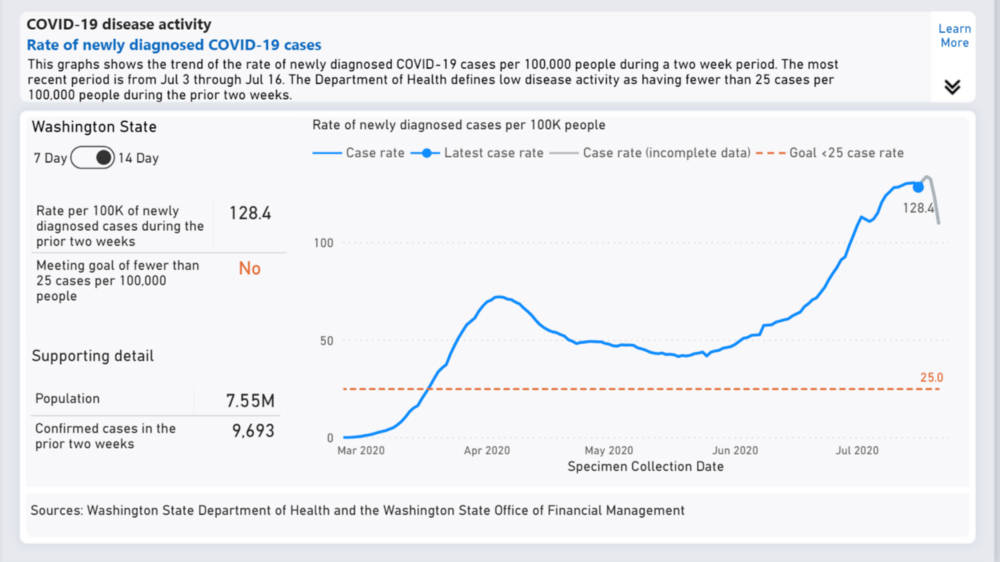 This is an image from the risk assessment dashboards on www.coronavirus.wa.gov. Through June and July, the number of people diagnosed with COVID-19 in the previous two weeks per 100,000 population steeply increased. The number of people who have been tested has also increased, but the percent of people who test positive hasn’t drastically decreased. This is one way we can tell that the increase in the number of people with COVID-19 is due to increases in the spread of the disease in our communities and not just increases in testing.