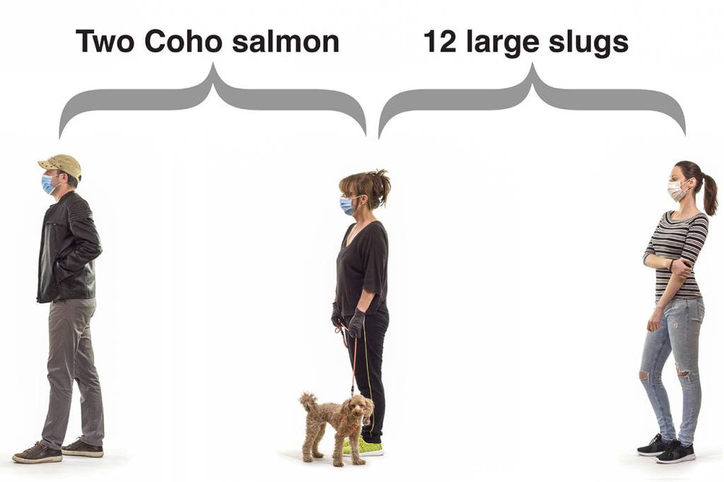 • Or you could imagine two large dogs standing head to tail between you and your friend. Or three Coho salmon. Or 12 large slugs.