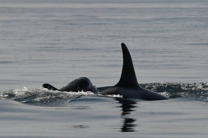 New calf, J57, with mom, J35 (Katie Jones/ Contributed photo Center for Whale Research. Permit #21238.)
