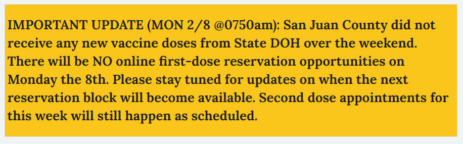 San Juan County did not receive any new vaccine doses from the Washington State Department of Health over the weekend. There will be NO online first-dose reservation opportunities on Monday, Feb. 8.