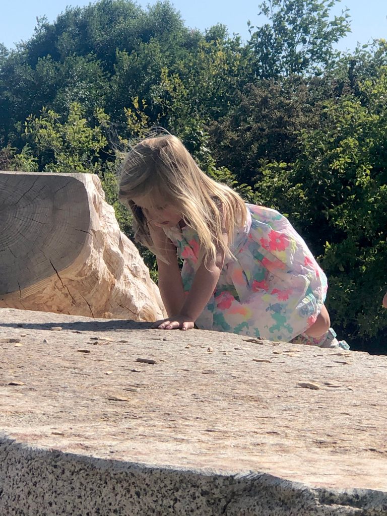 The design was created by Greenworks of Portland, Oregon and mimics what children might find in the woods or on the beach: rocks to climb, logs to scramble and sand to mold. It was built around a decades-old heritage willow tree and also features a sculptural slide, designed and constructed by Zackarya Leck.