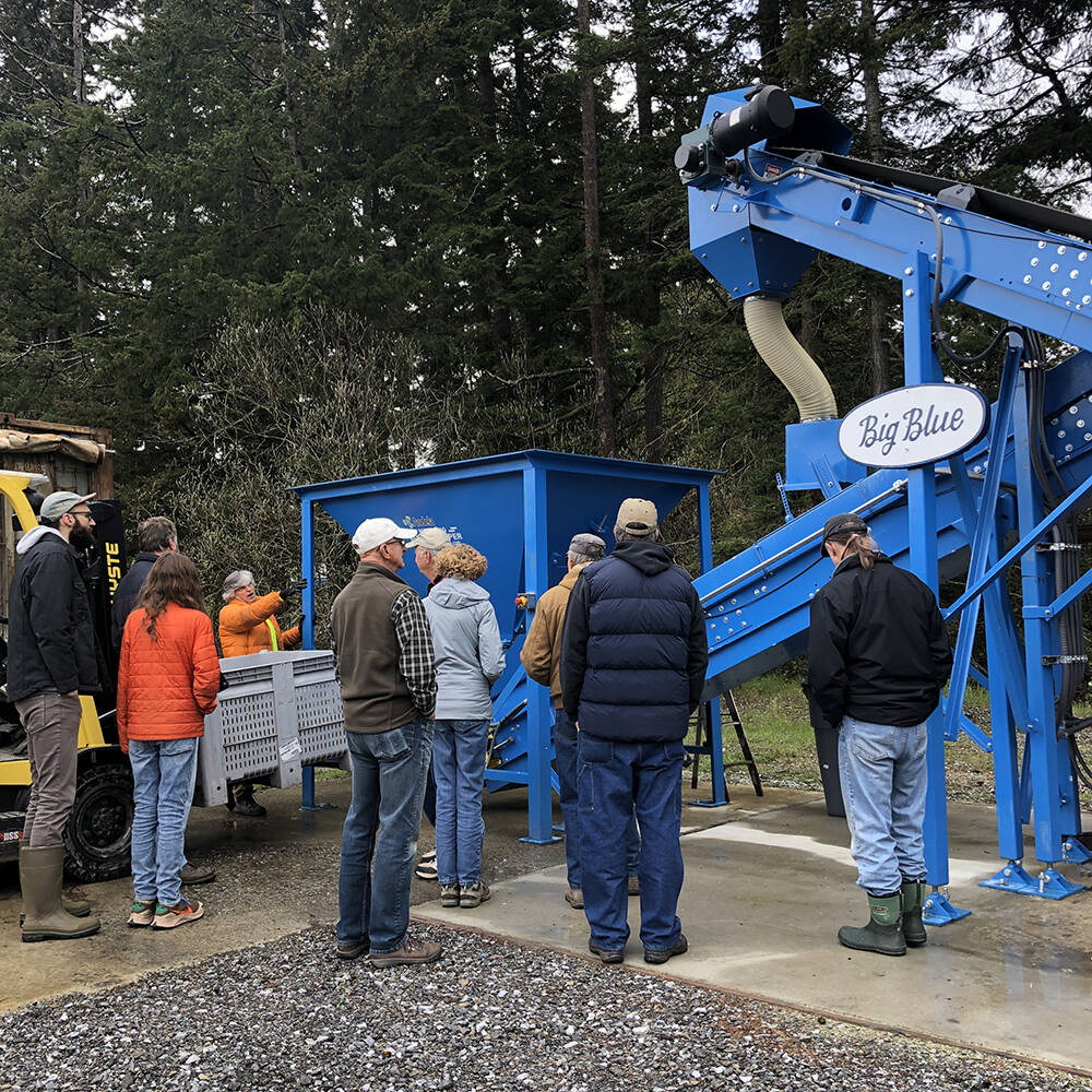 Surrounded by the cool, crisp spring air, a small group gathered together on a quiet Saturday morning in the recycling area at the Orcas Transfer Station, eager to witness the capabilities of the newest addition to local recycling initiatives – Big Blue, the glass crushing machine.
