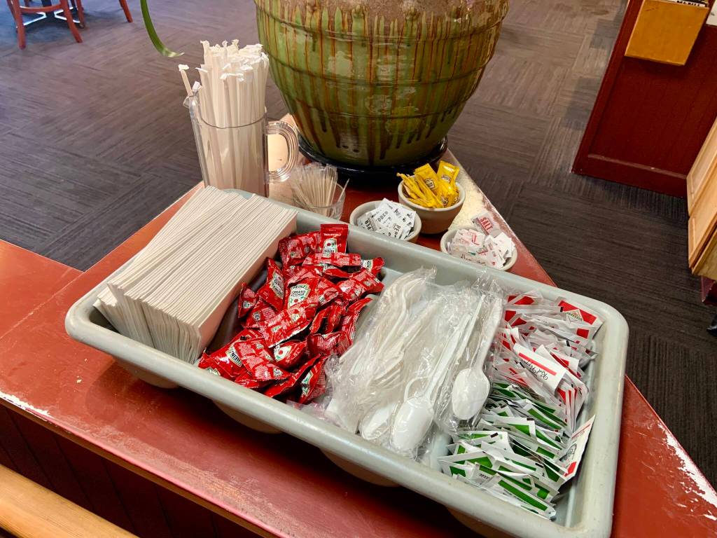 To receive a single-use food service ware item, customers must request it, confirm their choice when asked, or select the item they want from a self-serve station. Customers are also encouraged to bring their own durable, reusable food containers, utensils, and straws to help reduce single-use waste.