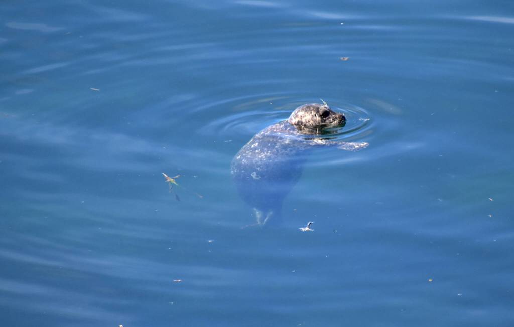 A harbor seal floats lethargically in the shallow waters near the site of the vessel sinking surrounded by a sheen of diesel fuel.