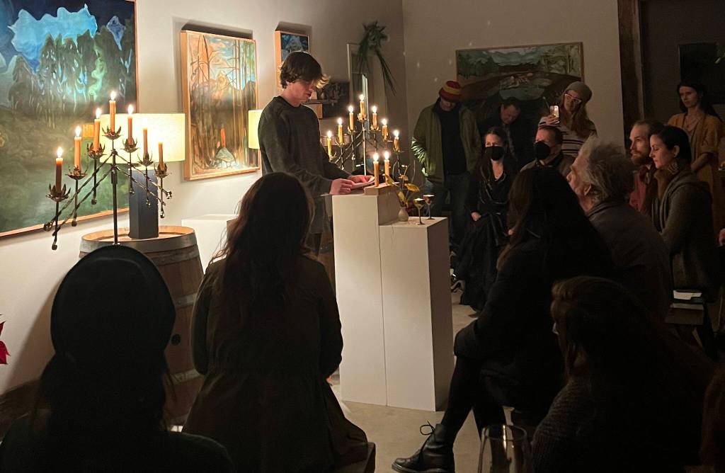 Writer stands. Walks to the center of the room, organizes themself behind a white pedestal topped with a small reading light, four warm, dancing candles and a modest hibernal flower arrangement nested in a handmade ceramic vase. They put on their eyeglasses, or take them off, offer a bit of backstory about their piece, or not, and begin reading.