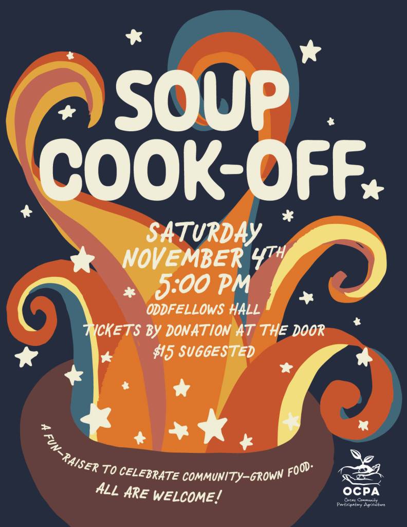 Join the fun on Nov. 4 at 5 p.m. at the Odd Fellows to taste a wide variety of soups and celebrate community agriculture! Local teams from the Orcas Community Participatory Agriculture community farm network and the Orcas community at large are invited to prepare soup to nourish everyone attending this event. It will be a friendly competition — local ingredients are strongly encouraged!