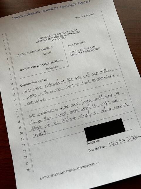 Henline was charged by the office of the U.S. Attorney for the District of Western Washington with violating the federal arson statute. He has been detained in a federal correction facility since his arrest in April 2022, while his case proceeds. After eight days of testimony, almost entirely by the prosecution’s witnesses, the jury notified the court on its third day of deliberations that it was unable to reach a verdict. U.S. District Court Judge John Chun, who presided over the case, read the jury some additional general advice on how to break their impasse and sent them back to continue deliberating. But mid-afternoon that same day the jury once again declared that they were unable to reach a verdict; minutes later, the judge declared a mistrial.