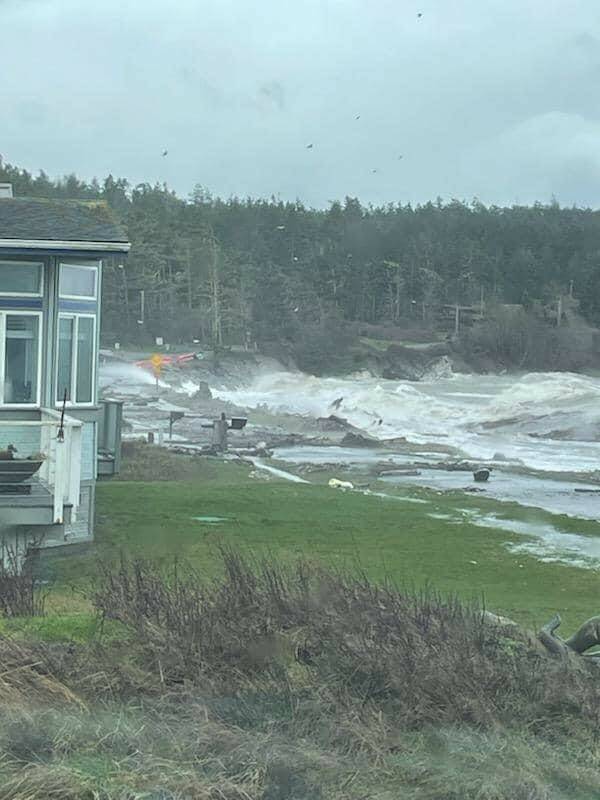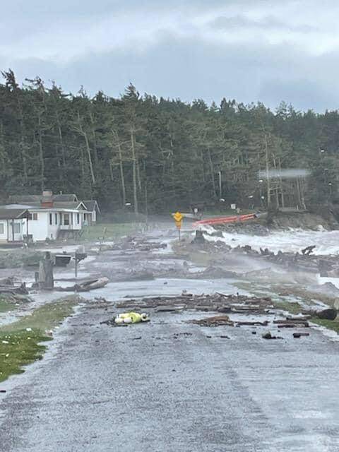 The San Juan County Sheriff’s Office reported that at 11:55 a..m. MacKaye Harbor Road was washed out in the 1600 block of MacKaye Harbor Road / Outer Bay area. Mckay Harbor Road was reportedly impossible to access and the southern end of Lopez Island was cut off due to road blockage. Public Works is assessing the situation and is aware of areas where the roadway pavement has been compromised by coastal erosion, however, a complete damage assessment is not possible until conditions improve. Hazard warning signage is out.
