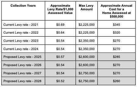 Voters will be asked to consider a four-year replacement levy of $2,600,000 for 2025 and 2026 and $2,750,000 for 2027 and 2028. The approximate annual levy rate would be $0.57 for 2025, $0.54 for 2026, $0.54 for 2027, and $0.52 for 2028 per $1,000 assessed value. The new proposed levy rate’s four-year average is actually less than the current levy’s four-year rate! It is also important to note that the total amount collected will not increase after it is placed.