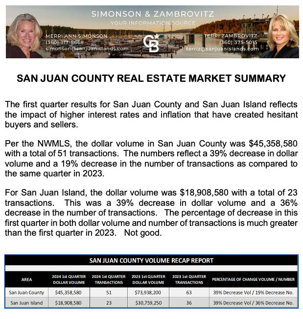 The first quarter results for San Juan County and San Juan Island reflects the impact of higher interest rates and inflation that have created hesitant buyers and sellers.
