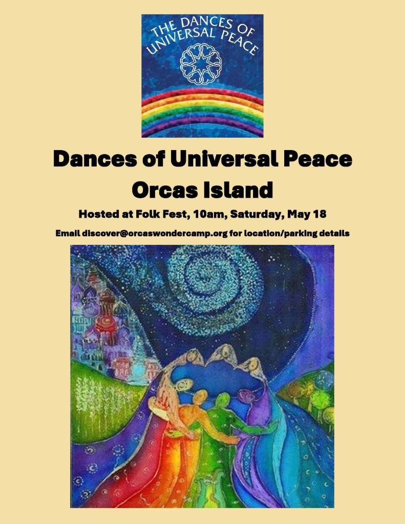 Saturday, May 18, the Folk Fest opens at 10 a.m. in Moran Park with Dances of Universal Peace. This spirited circle dance includes folk traditions from around the world. Led by Libby Garcia with friends from Orcas and across the PNW, the dances are a call for Peace through dance and music. Parking is limited and a day pass is required, so plan to arrive early at 9am. Tickets are available at https://518folkfest24.eventbrite.com and include the day pass for the full Folk Fest Fair and an afternoon of music. Scholarship passes for the morning dances can be requested at discover@orcaswondercamp.org .