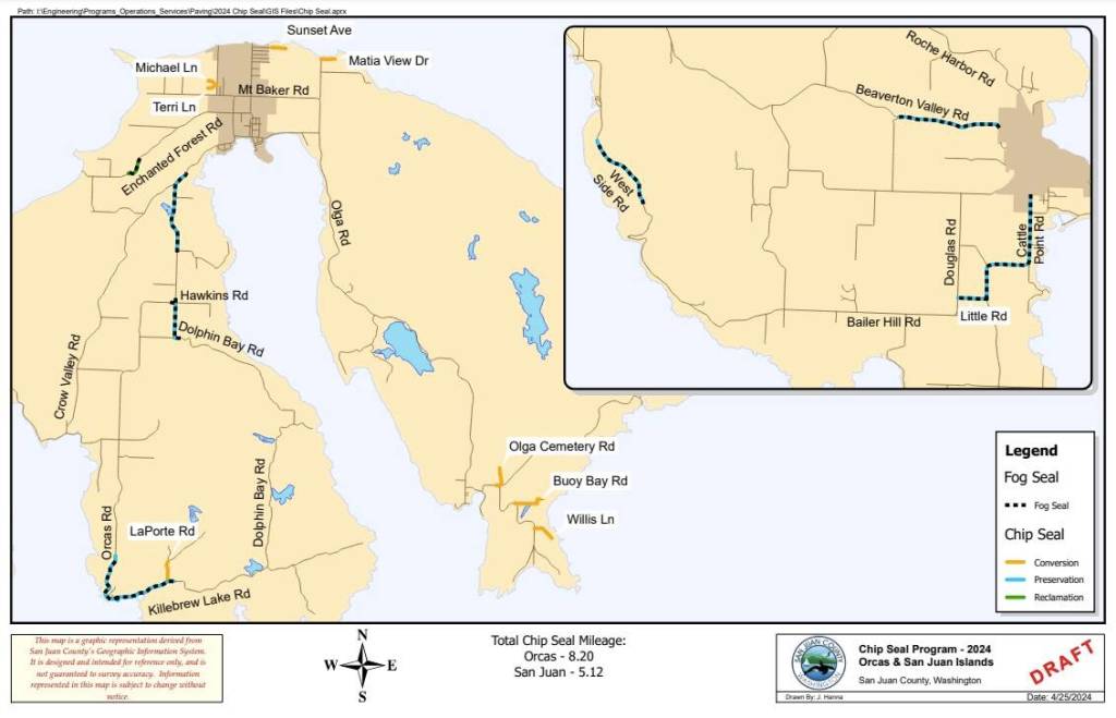 Lopez and Shaw Islands are not part of the 2024 chip seal program. Public Works will continue to monitor the condition of roads and address problems as needed.