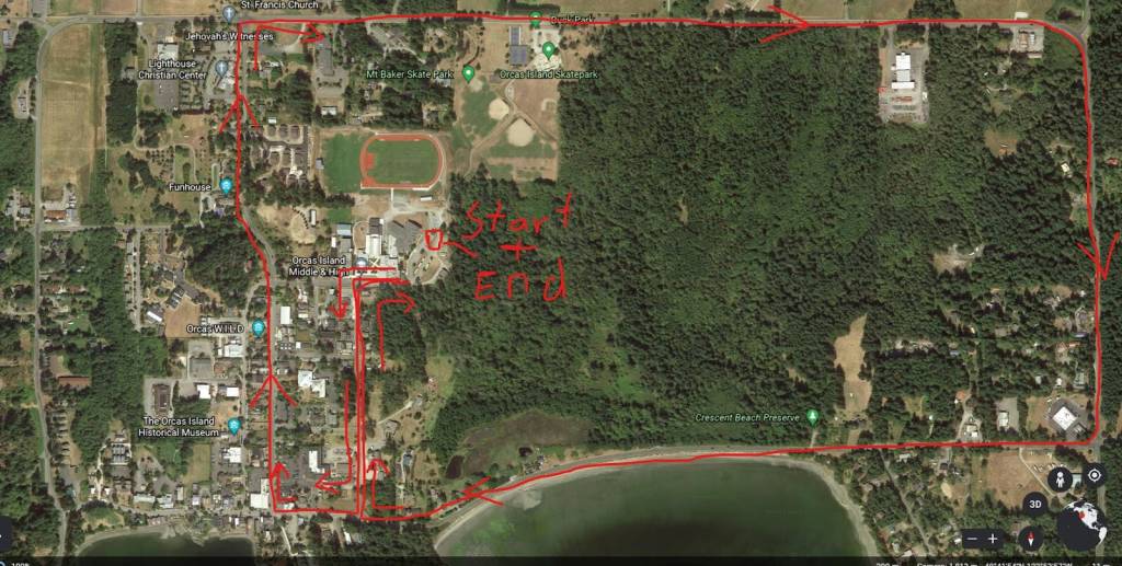 The parade will begin shortly after the end of the graduation ceremony. The parade will begin by 4 p.m. and circle through town and around greater Eastsound. The parade will start and finish at the high school. Please see the above map of the route. It will head south on Madrona Street from the High School then north up North Beach Road, turning right onto Mount Baker Road, continuing up the Terrill Beach Road hill then right onto Crescent Beach Road and finally ending up back at the High School.
