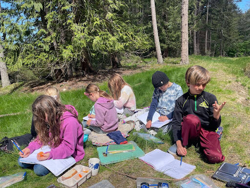 Meanwhile members of Salmonberry’s Cedars class of 3rd graders has spent one full day each week all year, rain or shine, in an awe-inspiring old growth cedar grove on the island. Here students have kept nature journals, connected with “sit spots,” experienced the calming energy of the forest, explored the area and hiked the mountain, used cooperative problem-solving with a partner during “construction” and played together with only the things nature provides.