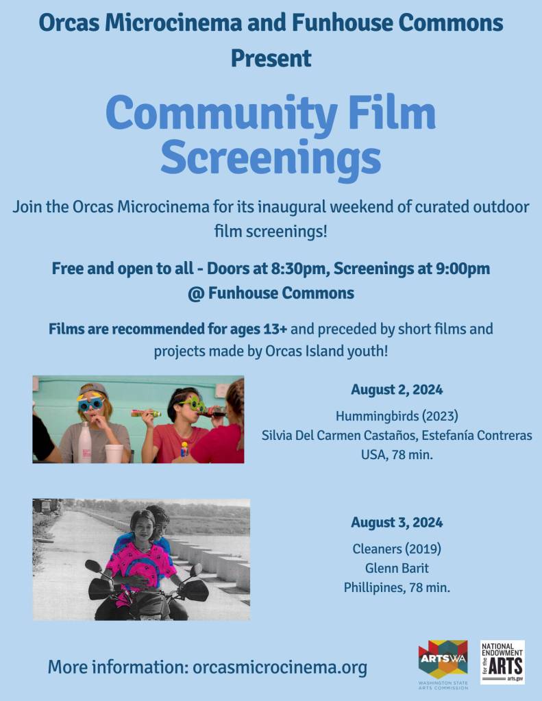 The Microcinema Outdoor Film Festival is also on Aug. 2. Doors at 8:30 p.m., the screening is at 9 p.m. Screening of workshop participant films before Orcas Microcinema presents HUMMINGBIRDS, a youth-directed, written and produced film about teens living on the Texas/Mexico border. Free to the public.