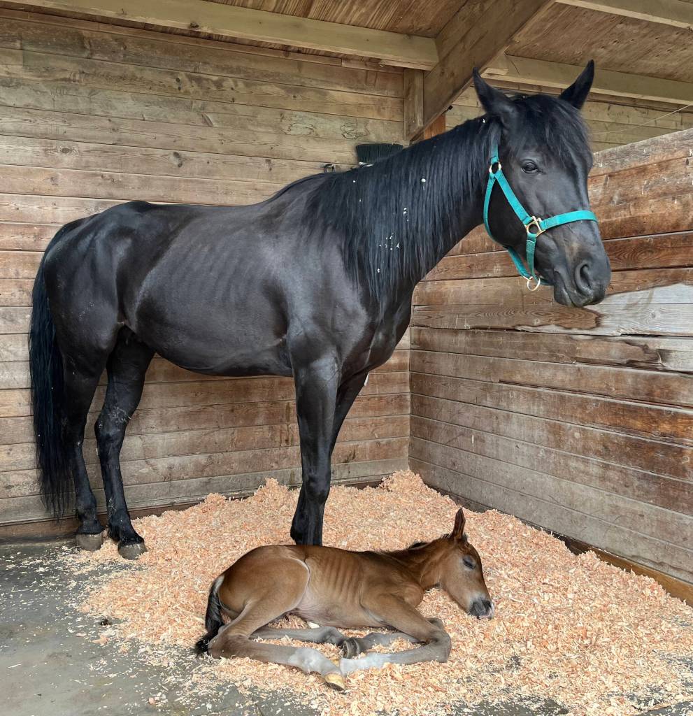By May 10, Newberry began sleeping in the tack room adjacent to Lucky’s stall. She set an alarm for every two hours. After five days, in the middle of the night, she woke up to discover a newborn filly. Everyone spent the next few days vigilant with the new baby, and Newberry began imprinting, a way for handlers to bond with foals. She’s since worked with her daily and plans to keep her for at least a year, before assessing their next steps. Foals are not ready to ride until they are at least a few years old.