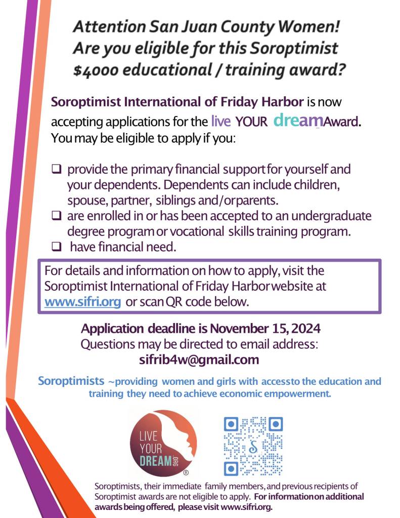 Soroptimists provide support in many ways for women and girls in our community, and this is part of our program, which is designed to empower women through education. The online application can be accessed through our website, www.sifri.org. We can provide hard copy applications if needed and will be happy to answer questions at sifrib4w@gmail.com. The deadline for receipt of applications is Nov. 15, 2024.