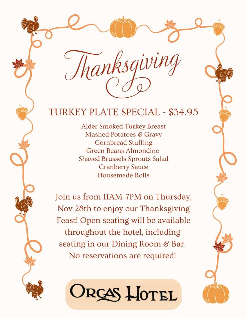 Orcas Hotel is hosting a Thanksgiving dinner.