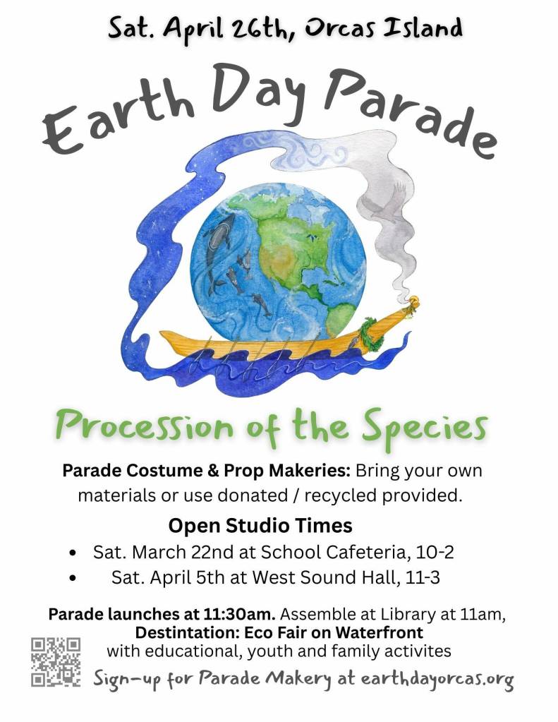 Come celebrate Earth Day Orcas all month long in April. Organizations from across the islands are joining to offer inspiring, educational and fun community activities. The parade is on Saturday, April 26, and parade costume and a prop workshop is on Saturday, April 5, at West Sound Hall. Open Studios, group contingent projects and you are welcome to bring materials to share with others or use the donation collection. Save a seat at https://earthdayorcas.org. Visit https://earthdayorcas.org for more info.