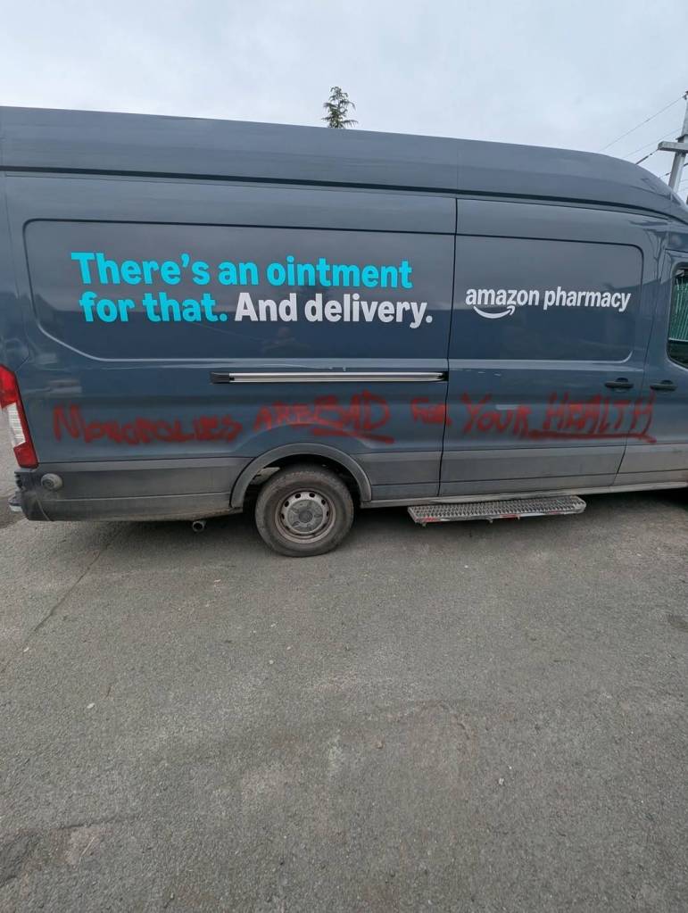 Recently the San Juan County Sheriff’s Office responded to a report of vandalism in the Lot C area, where an Amazon van was spray-painted with the message, “Monopolies are bad for your health.”