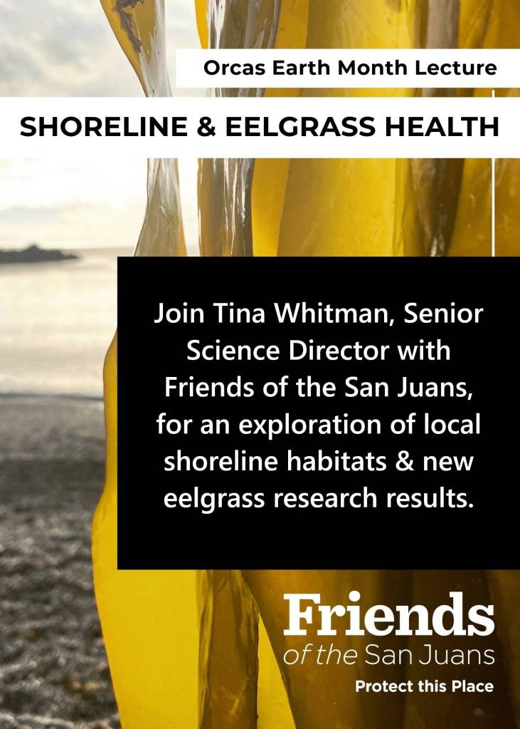 Eel Grass and Shoreline Update with Tina Whitman, senior science director at Friends of the San Juans, shares news about their research and findings about the state of the Salish Sea, 7 p.m.