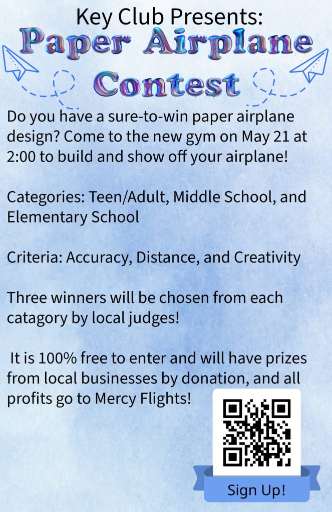The Orcas Island Key Club is putting on a Paper Airplane Contest in support of Mercy Flights. We invite anyone in elementary school and up to engage in a paper airplane contest at the high school gym at 2 p.m. on Wednesday, May 21.