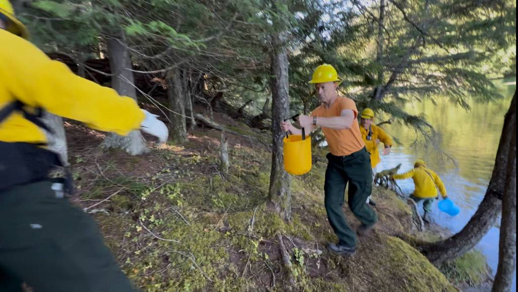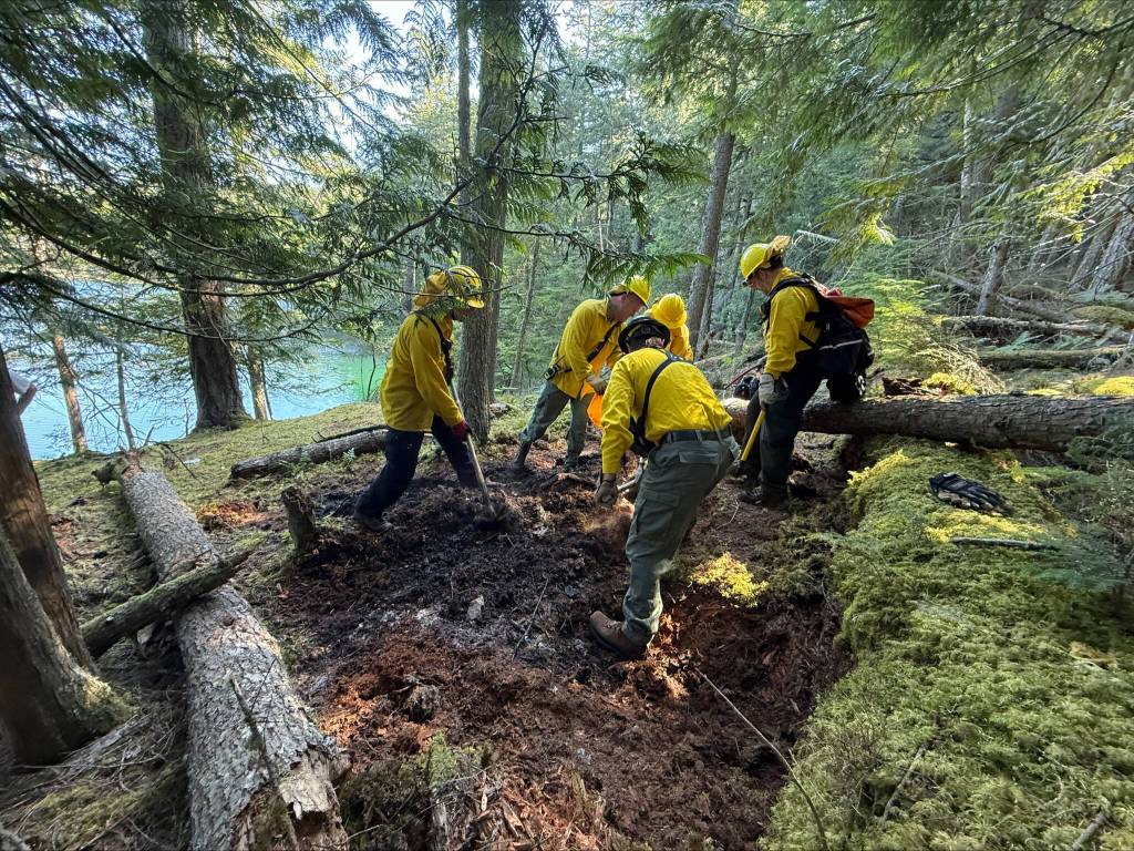 A bucket brigade from the lake was established to fully douse the area and eliminate any underground fire pockets. The quick response from the reporting party and campers who came to the scene aided in a successful outcome with minimal fire damage. The likely cause of the fire was due to an illegal campfire in an illegal, off-trail campsite.