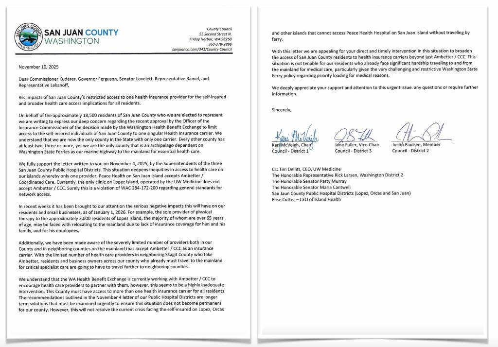 Hospital district superintendents sent their own urgent letter Nov. 3, noting that “UW Medicine will leave Lopez Island Clinic in June 2026, and a new operator has not been identified. Ambetter does not contract with UW, and it is unknown if a future provider will.”