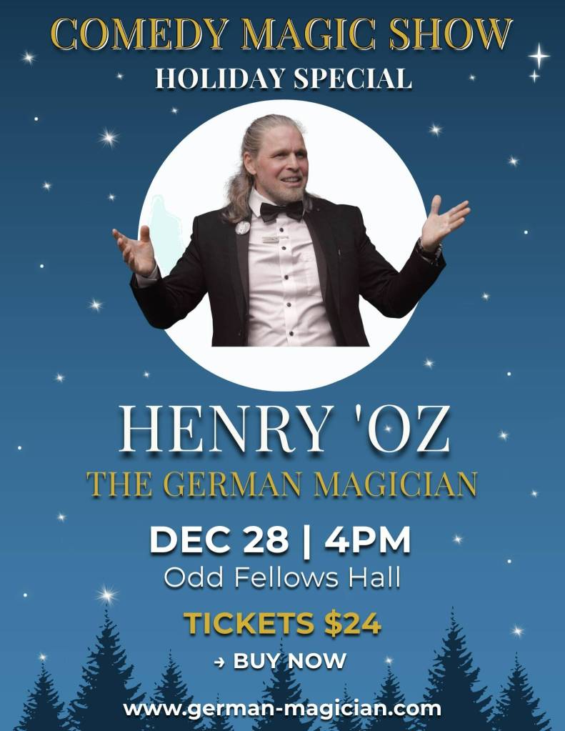 After his November performance at Sea View Theatre (135 guests, 4.95 out of 5 stars from 21 reviews), professional magician Henry ‘Oz – The German Magician returns with a special holiday show at Odd Fellows Hall on Sunday, Dec. 28, with doors opening at 3 p.m. and the show starting at 4 p.m.