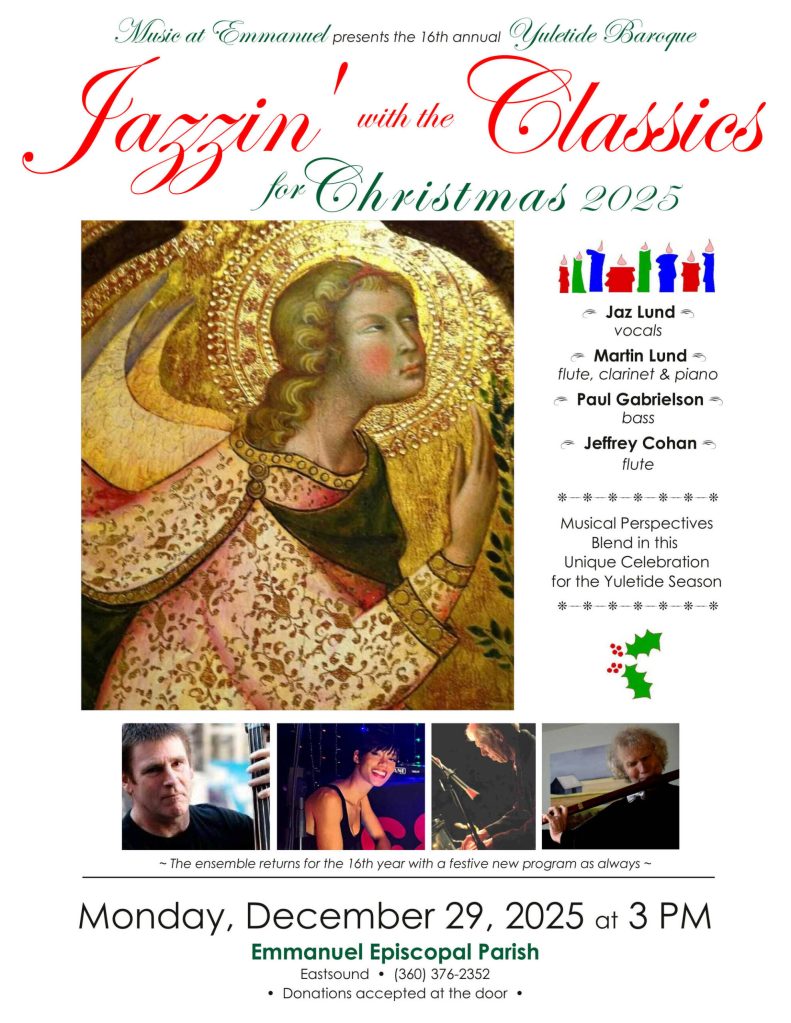 Emmanuel Episcopal Church presents the 16th annual “Jazzin’ with the Classics for Christmas,” featuring rhythm and blues vocalist Jaz Lund and her father, jazz pianist, flutist and clarinetist Martin Lund, classical flutist Jeffrey Cohan and bassist Paul Gabrielson in a unique and joyous celebration of music for the holidays that bridges the jazz/classical divide on Monday, Dec. 29, at 3 p.m. at Emmanuel Episcopal Church in Eastsound.
