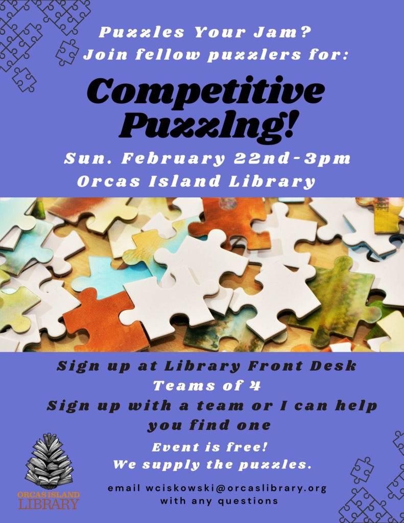 The event will be on Sunday, Feb. 22, at 3 p.m. at the Orcas Library. It is free to participate. Space is limited, so sign up in advance at the library front desk. You can register with your teammates (maximum four people) or sign up solo, and we’ll match you with other puzzlers.
