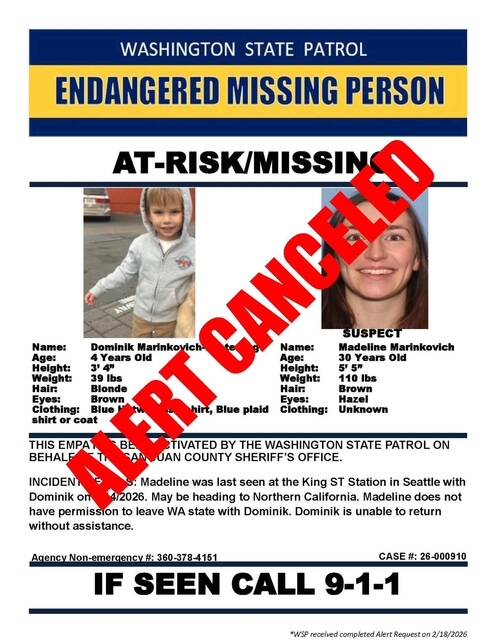 The San Juan County Sheriff’s Office issued a warrant for Marinkovich’s arrest, the Seattle Police Department was contacted and a Missing Persons alert was issued nationwide. The evening of Feb. 19, the two were located, and the alert was canceled. A hearing was scheduled for Monday, Feb. 23, according to San Juan County Sheriff Eric Peter, although she is not expected to return to the island until midweek.