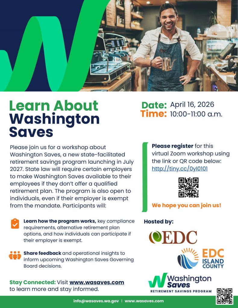 The San Juan County and Island County EDC will host a free online workshop led by Washington Saves to help business owners understand the new state-facilitated retirement savings program. The session, Introduction to Washington Saves, will take place on Thursday, April 16, from 10-11 a.m. online via Zoom.